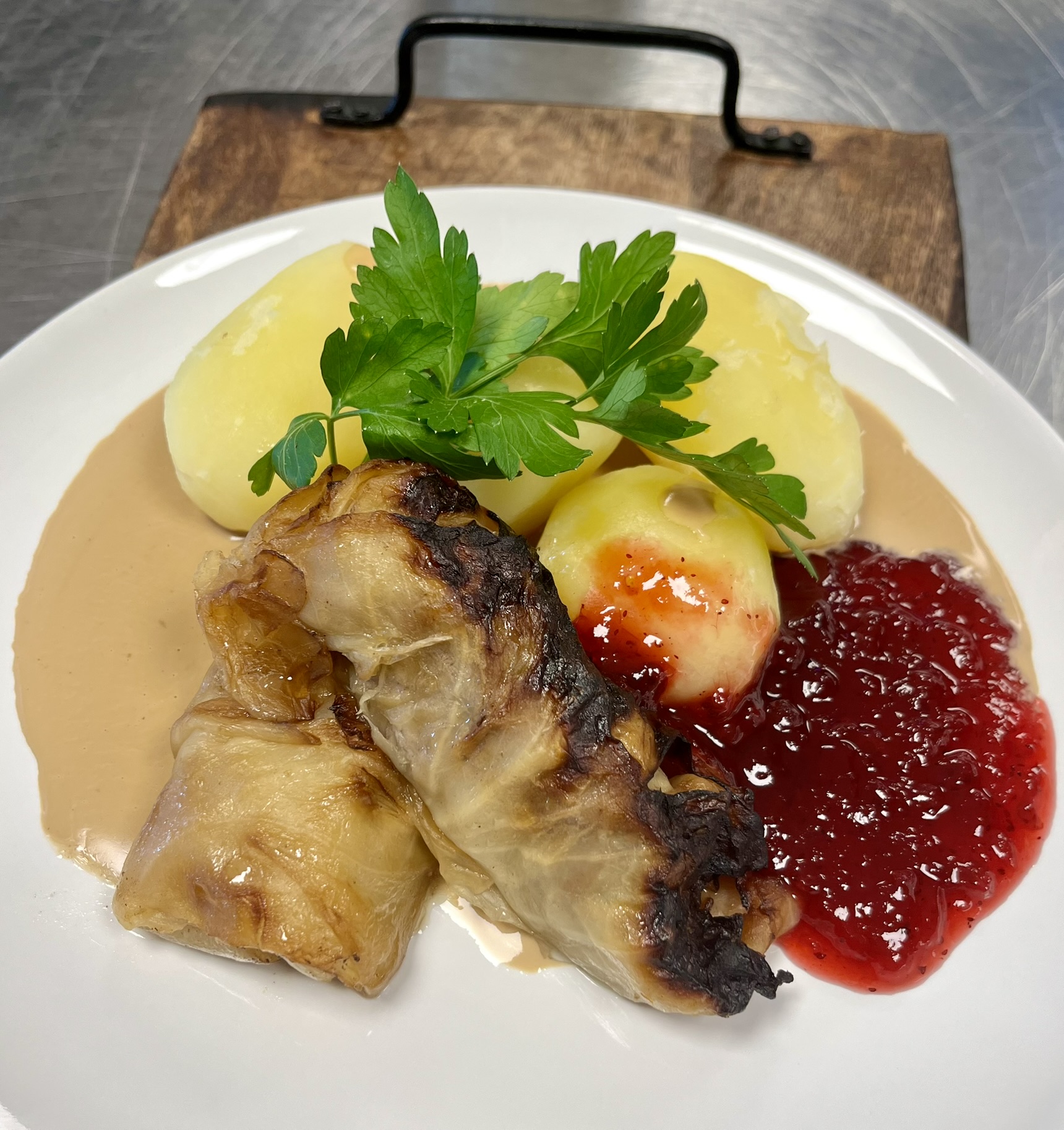 Kåldolmar med kokt potatis, gräddsås och lingon.