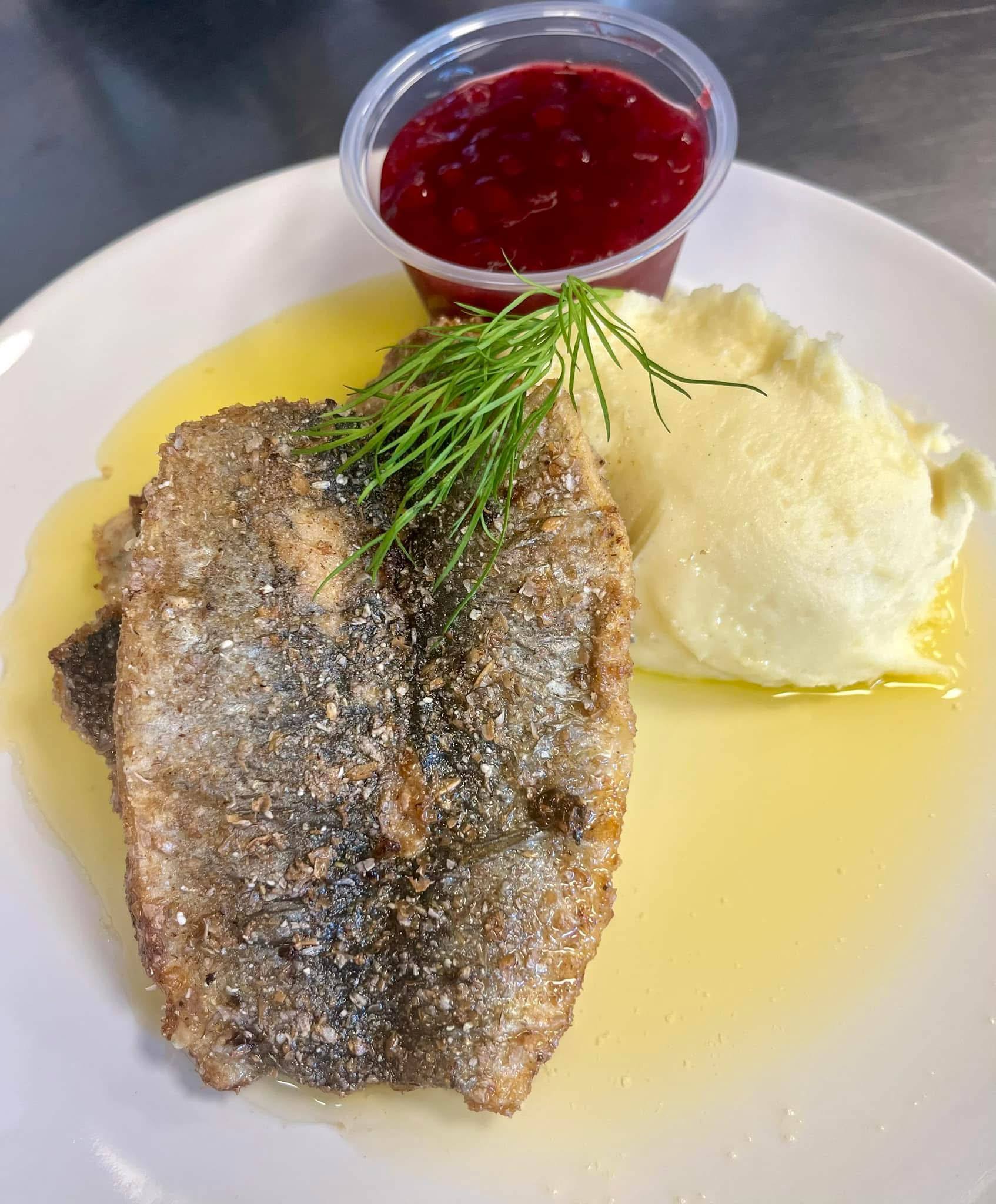 Pannbiff med kokt potatis, gräddsås och lingon.